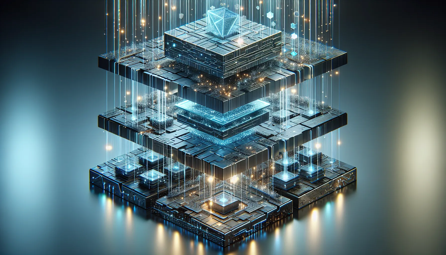 3D layered blockchain architecture showing three distinct tiers with glowing nodes and data streams