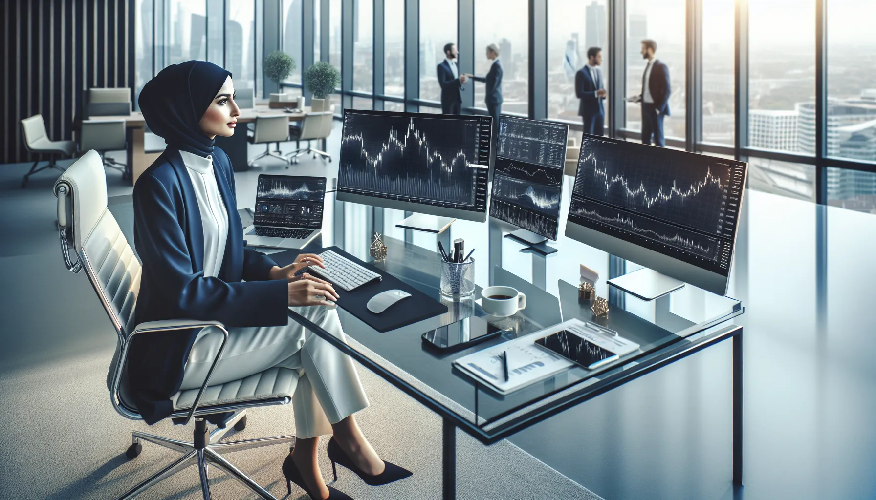 Professional trader using advanced charting tools and technical analysis on multiple monitors in modern office.